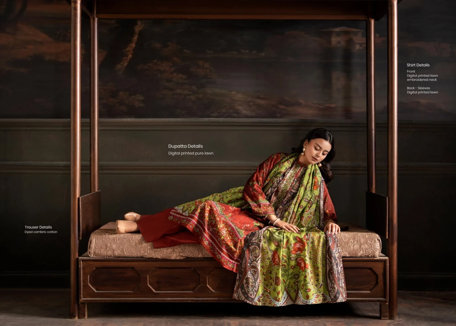 Digital Printed Lawn Dupatta ,Digital Printed Lawn Shirt (Front, Back & Sleeves) ,Dyed Cambric Cotton Trousers |