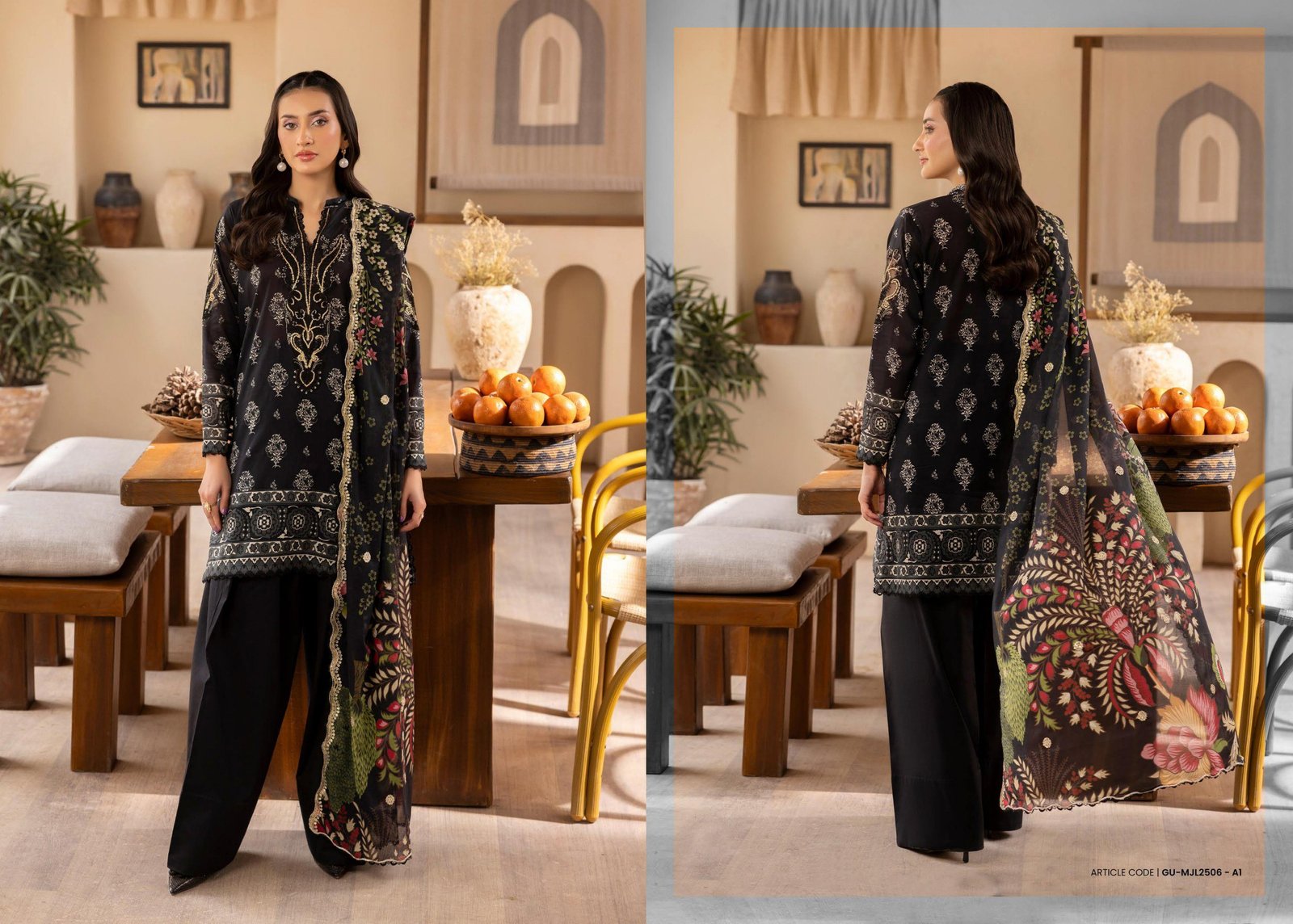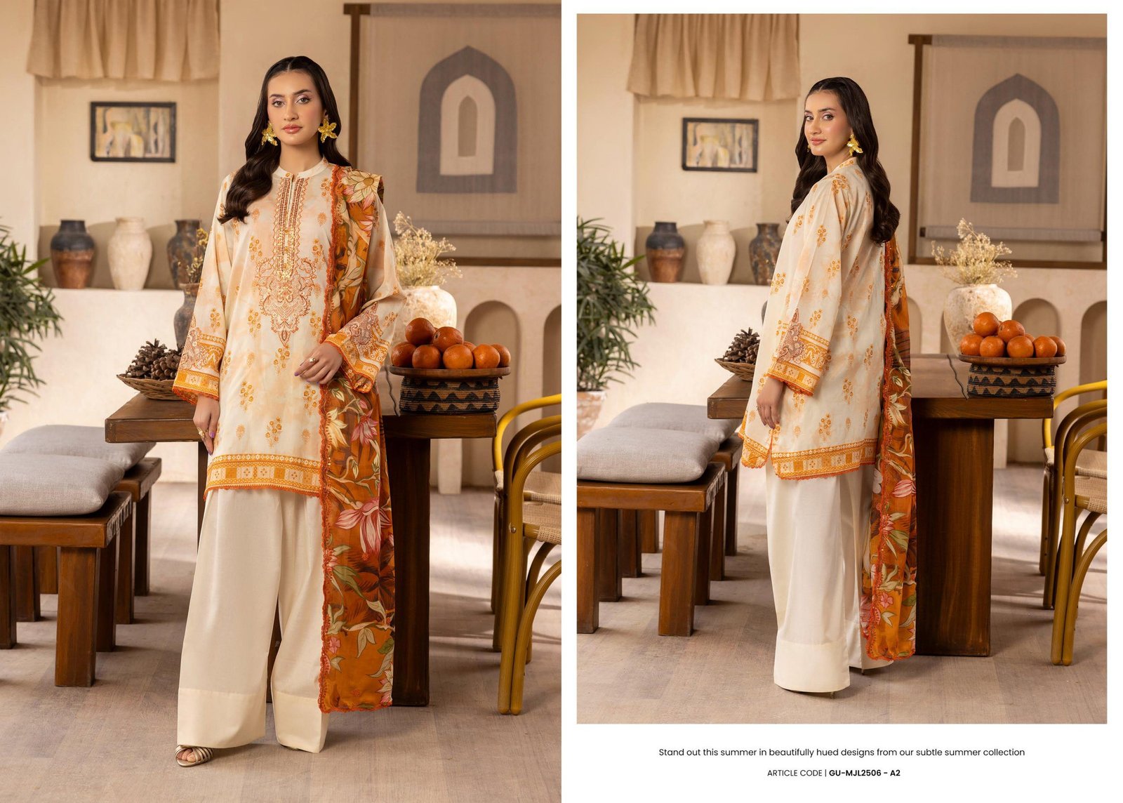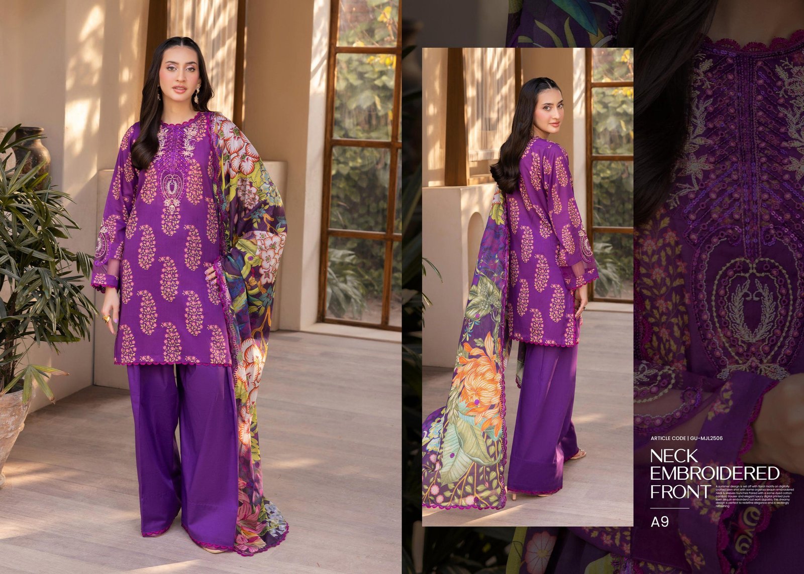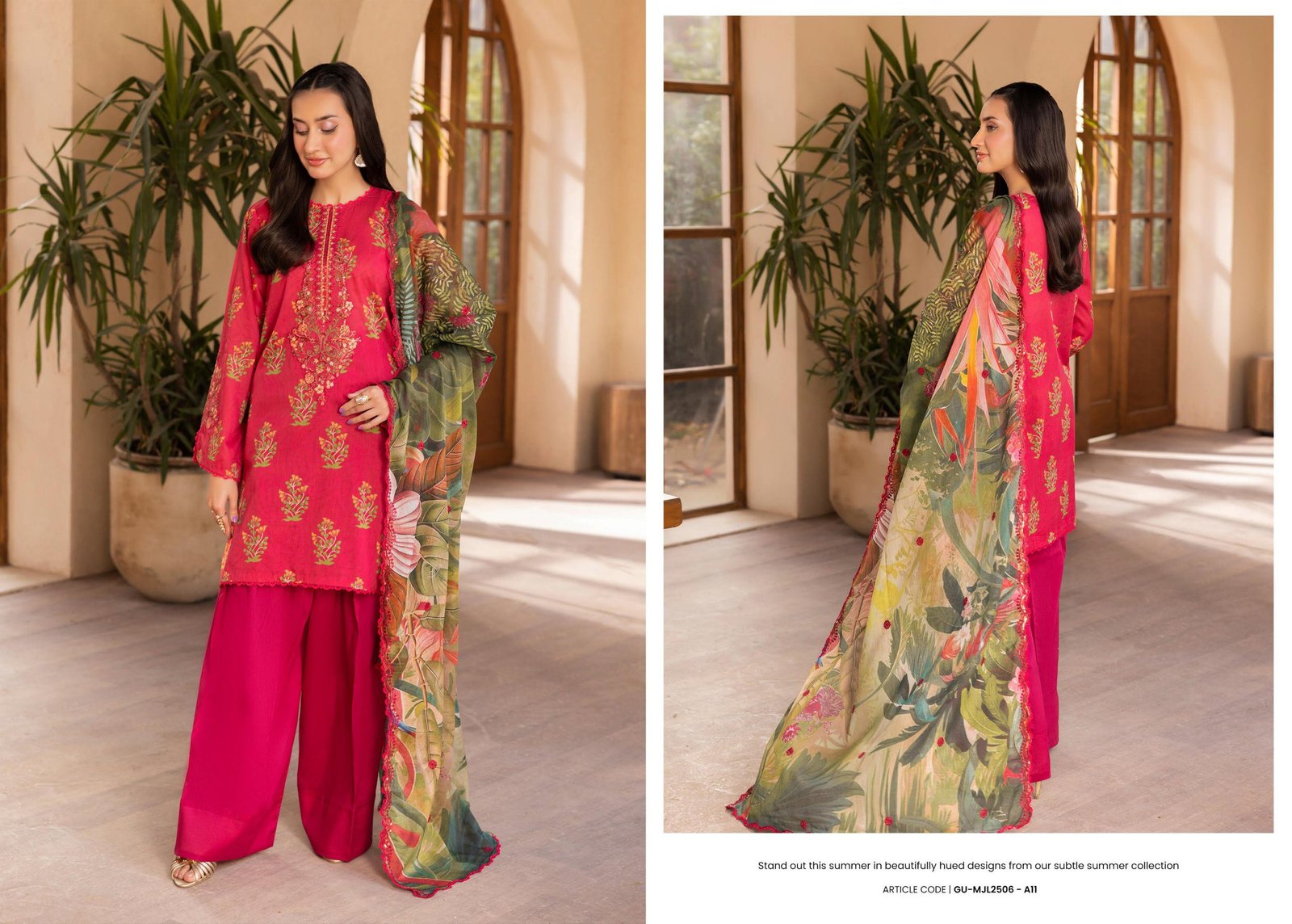 Mahajal by Gull Jee is an elegant 3-piece embroidered lawn suit featuring luxury digital prints, a stunning sequin-embroidered dupatta, and premium fabric – perfect for the summer season.